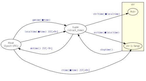 timeライブラリには色々な関数があるが、関係がよくわからんので、図にまとめてみたが、分かりやすくなってなのは気にしないでくれ。 「float」は1970年1月1日が開始してからの秒数。 「tuple」は (年, 月, 日, 時, 分, 秒, 曜日, 年日, 夏時間フラグ) とい…